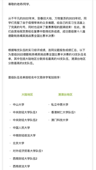 2022年11月15日-2023年2月24日,2022德勤税务精英挑战赛团队赛道复赛以线上线下相结合的方式举办,我院派出李函育、刘书妤、周宇翔、滕明璨、童梦瑶、姚荔婷六名同学,与商学院郭湘同学、会计学院余尚同学一起组成两支队伍参加比赛。经过激烈的角逐,两支队伍从复赛的26支队伍中脱颖而出,顺利晋级全国半决赛。