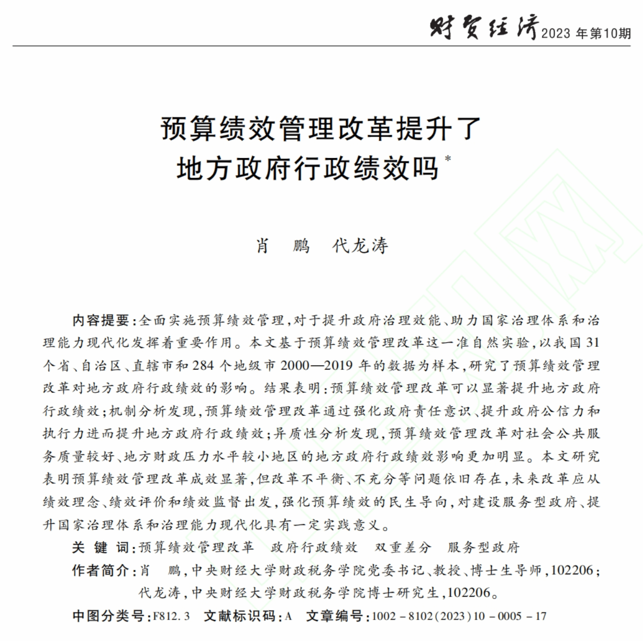 近日,由伟德国际1946bv肖鹏教授和代龙涛博士撰写的论文《预算绩效管理改革提升了地方政府行政绩效吗》在中文A类期刊《财贸经济》2023年第10期作为封面文章刊发。以下为文章主要内容: