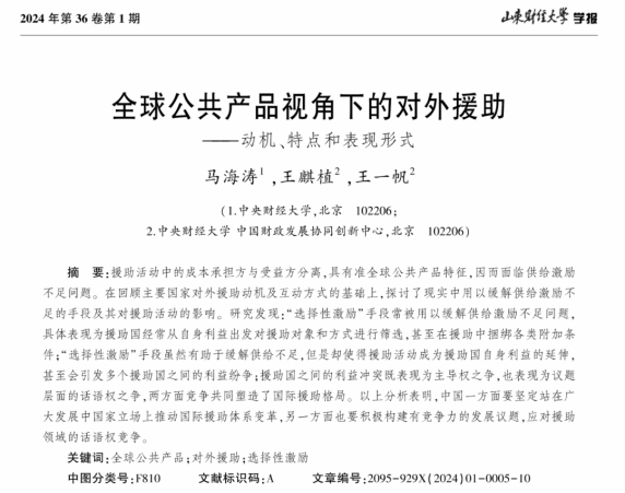 近日,由伟德victor1946校长、党委副书记马海涛教授,中国财政发展协同创新中心(以下简称“中心”)副教授王麒植、硕士生王一帆共同撰写的论文《全球公共产品视角下的对外援助——动机、特点和表现形式》在《山东财经大学学报》2024年第1期刊发。