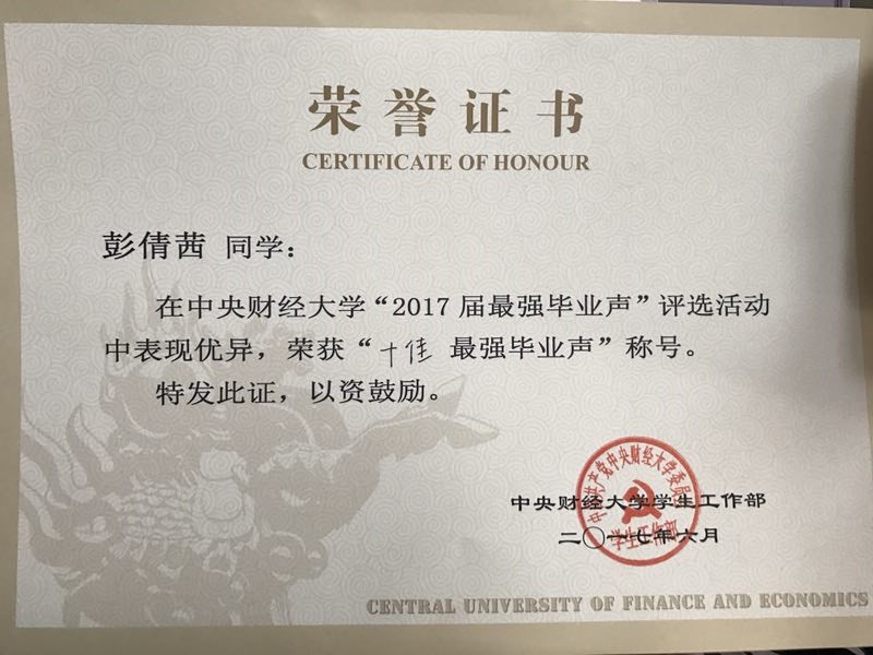 6月13日下午,我校“最强毕业声”评选活动在学院南路校区中财大厦如期举行,我院本科毕业生代表财政13-1班彭倩茜同学通过层层筛选,在最终演讲比赛中荣获“十佳最强毕业声”。