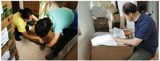 学生们在校时间长,需要打包的物品多,打包一名女生的物品往往需要两三个小时、十几个包裹。老师们与学生全程进行视频连线,耐心细致的与同学们沟通。三天的工作下来,老师们已经到达了体力的极限。我们劝年长一点的老师们休息一天,可是杨志清老师却说,“大家都一样辛苦,我没问题的,能和大家一起劳动做事既是机会难得也很开心,何况是为我们的孩子(学生)做事”。65岁的刘桓老师,在寝室忙碌不停,把学生当做自己的孩子一样,将行李分门别类的打包好,无法邮寄的用品,就暂存在自己的办公室。有学生怕麻烦老师,扔掉的东西多,刘老师开玩笑说道:“这些东西都不要,你家里人知道吗?” 张京萍老师整理东西非常细心,一支笔、一张照片、一小管药膏都会认真询问学生是否需要,易碎品她都会用衣服包好再放进行李箱。财务处的徐先梅等老师,拿出做账的麻利劲儿和仔细劲儿,行李打包又迅速又规整,她们白天支援财税学院收拾行李,晚上还要回财务处加班。姜爱华老师一边打包行李,一边还不失幽默感,时而引得同学们捧腹大笑,“《税收筹划》这本书你得要吧,正好作者蔡昌老师在这,签个名给你寄回去”,“你们这个宿舍酷爱运动嘛,哑铃好几对,球拍好几个,瑜伽垫好几个,也不知道是真运动了还是装装样子”。