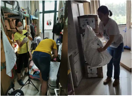 从床铺到桌底,从阳台到书架,无论多么隐蔽的角落、多么细小的物件,每一位老师都耐心地询问、小心地处理,为同学们细心整理好每一件留有青春印记的物品。桌前固定着全程视频的手机,记录下了每一位老师忙前忙后的身影、浸湿了汗水的上衣,还有惦念着同学们的满满爱意。在全院老师的全情投入下,430余名毕业生的行李已全部打包完成。