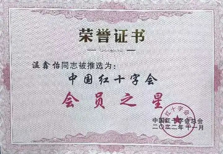 我校温鑫怡同学被评为其中一位“会员之星”,是我校红会首次有成员获得此荣誉,为我校的红十字事业起到带头作用。