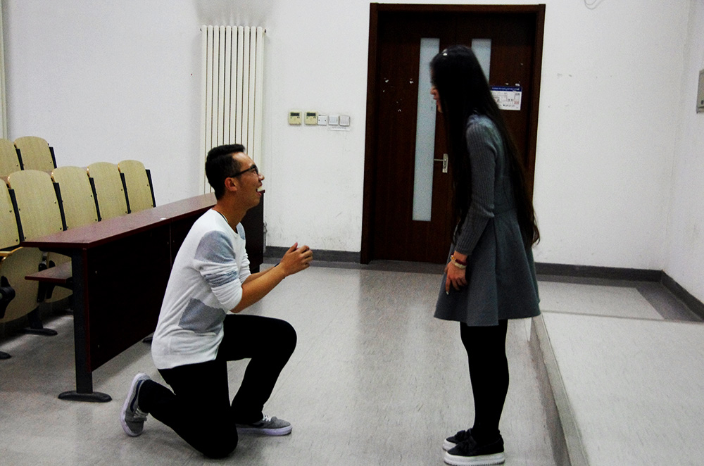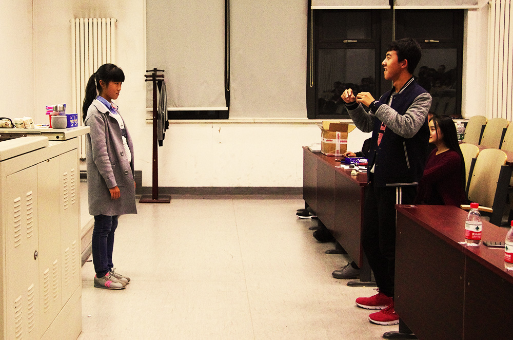 随后进行的是游戏环节。第一个游戏是你划我猜,一个男生和一个女生上台,男生用肢体语言比划出大屏幕上打出的词语,女生背对大屏幕猜测男要表达的内容。本轮游戏一共三组同学参与,男同学们在游戏中极尽所能,用肢体挑战高难度词汇,女同学们也大开脑洞,与同伴密切配合。最终在游戏中成绩垫底的一个小组接受残酷的惩罚。惩罚就是互喂芥末饼干!在座同学纷纷拿起手机拍照录像,记录下这精彩的时刻。