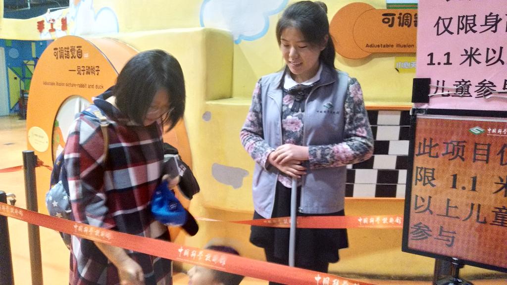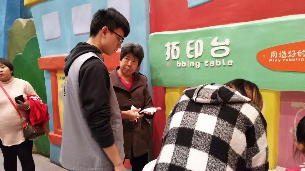 随后,工作人员为大家分配了岗位和任务,9点半,工作正式开始。我院的六名志愿者中,有三名同学被分配到了“紧急迫降安全体验”项目,这一项目旨在让小朋友们学习并体验飞机紧急迫降时的逃生方法,要求只有身高1.1米以上的小朋友才能参与。因此,志愿者们要负责测量小朋友的身高,引导小朋友排队依次进行体验;还有两位同学负责的是“小工地”项目,在这个项目中,小朋友们将带上安全帽,在模拟工地中体验建造房屋的过程。志愿者要负责为小朋友们带好安全帽,并陪同他们进入模拟施工现场,防止在活动过程中发生意外事故;最后一位同学负责的是“科学城堡”项目,在科学城堡中,小朋友们可以通过科学仪器,观察物理现象,体验太空航行。志愿者要负责引导小朋友们排队进入城堡,并为他们讲解一些相关的科学知识,让他们有所收获。
