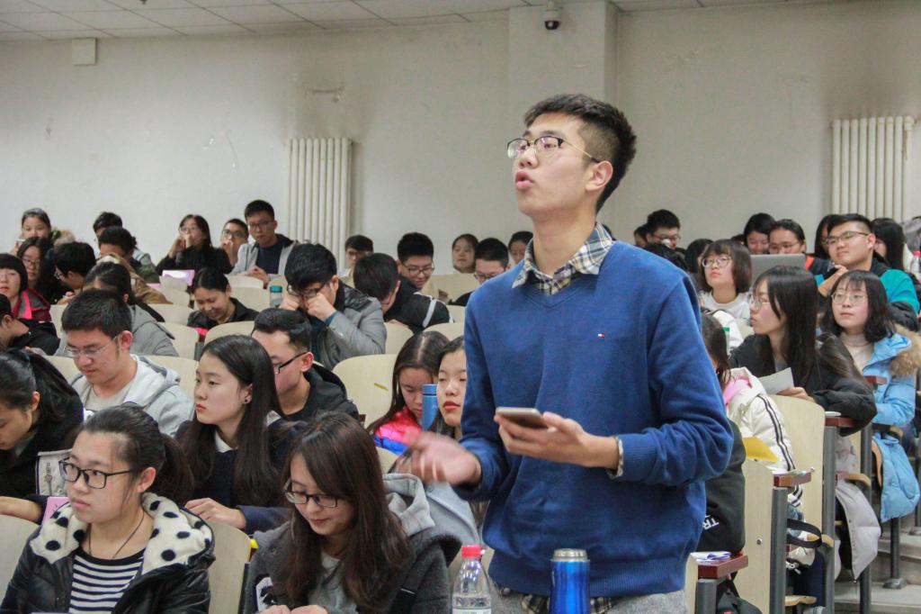 首先开始的是学习十九大团课,由何熙同学解读十九大报告内容,他用生动活泼的语言解读了十九大报告中“八个明确,十四个坚持”的具体要义,并以提问的方式和现场同学进行亲密互动,场下的同学们积极发言,认真回答。接下来由张弛同学对十九大报告内容总结并介绍本次基础团校模拟人大的活动规则。