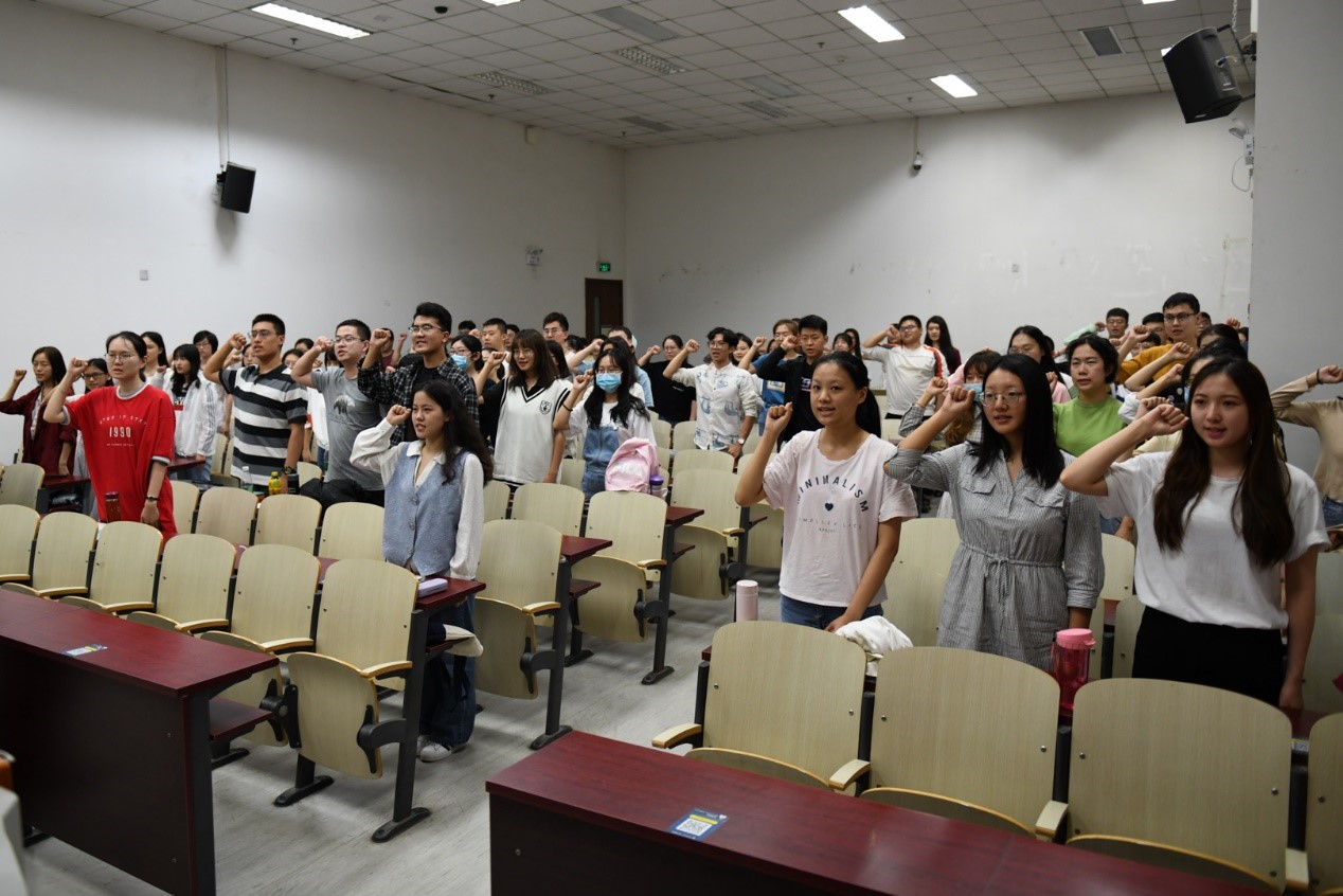 最后学院党委宣传委员庞淑芬老师告诫学生党员要不忘初心、牢记使命,并带领到场的全体党员重温入党誓词。