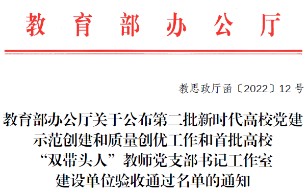 近日,教育部公布了第二批新时代高校党建示范创建和质量创优工作及首批高校“双带头人”教师党支部书记工作室建设单位验收通过名单,我院本科生第一党支部顺利通过