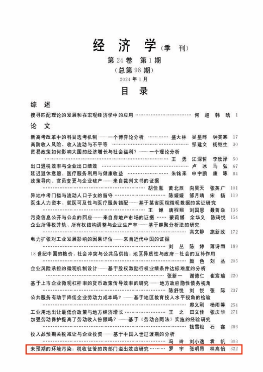 由伟德国际1946bv副教授张明昂、博士研究生罗宇与广东外语外贸大学林高怡合作撰写的论文《未预期的环境污染:税收征管的跨部门溢出效应研究》刊发于中文AA类期刊《经济学(季刊)》2024年第1期。以下为文章主要内容。